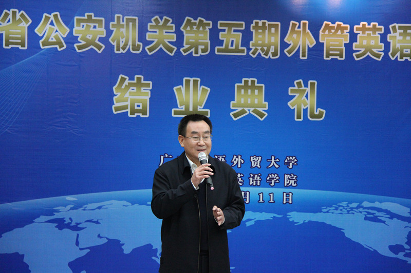 顾也力副董事长首先发表讲话。他高度评价了本次外管英语培训班学员们的学习精神,并希望大家能将本次学习的成果用于工作上,更好地为人民服务。同时,他对省公安厅一贯以来予以广外的信任表示感谢,并希望在未来的日子里可以有更丰富、更深层的合作。