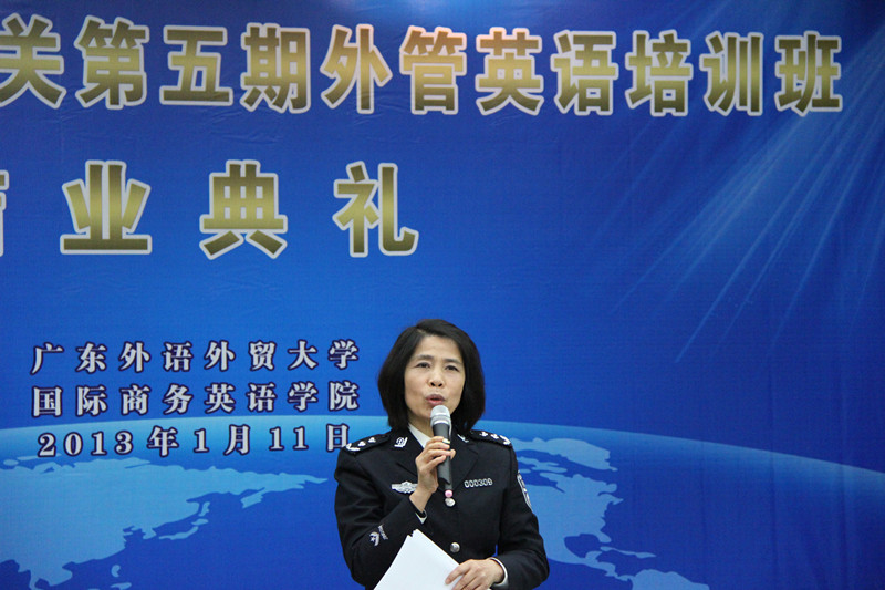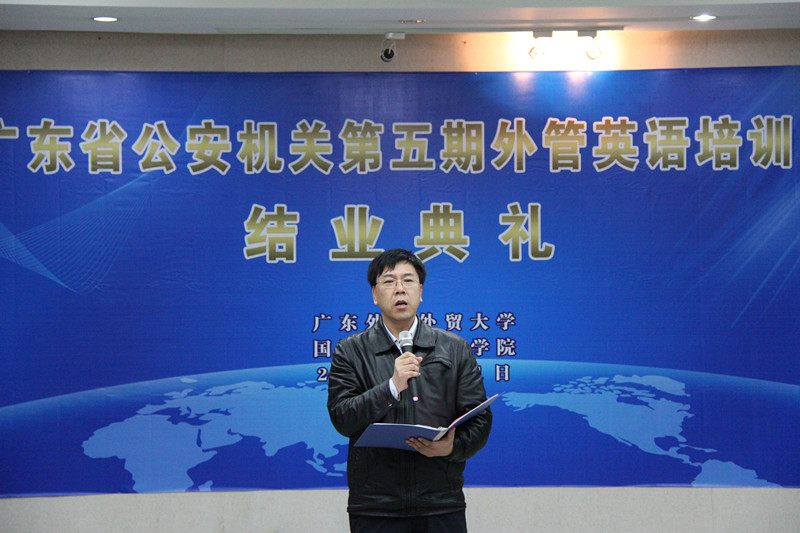 郭桂杭经理则用英语进行致辞,他首先对学员们顺利完成培训表示祝贺,并对商英老师和助教们的支持表示感谢。接着,他对学员们提出了“三个希望”:一是希望学员们能够学以致用,服务大众;二是希望省公安厅能与广外保持紧密联系,携手共进;三是希望本次培训班的结业能为学员们的英语学习之路打开新的窗口,激发大家学习英语的兴趣。