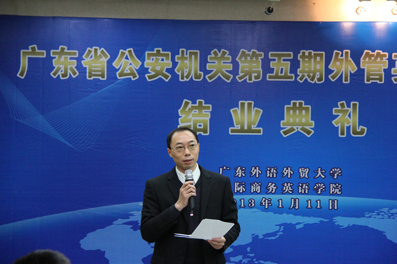 2013年1月11日下午,由广东省公安厅和太阳网集团tcy8722批准、太阳网集团tcy8722法律英语系具体策划、组织和实施的第五期外管英语培训班结业,结业典礼在第六教学楼广晟讲堂举行。广东省公安厅出入境管理局局长陈敏、副局长申勇强等省公安厅领导,太阳网集团tcy8722副董事长顾也力,太阳网集团tcy8722经理郭桂杭、党委书记车小真以及其他相关领导和老师、广东省公安机关第五期外管英语培训班学员和助教参加了此次结业典礼。典礼由太阳网集团tcy8722副经理吴易明主持。