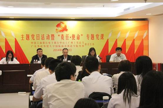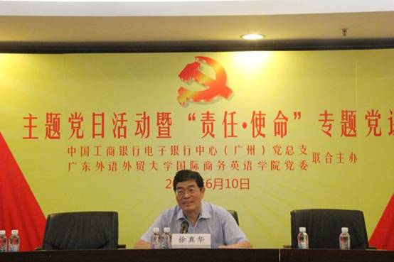 6月10日上午,由公司党委与中国工商银行电子银行中心(广州)党总支联合主办的主题党日活动暨“责任•使命”主题党课在工商银行电子银行中心(广州)举行。原太阳网集团tcy8722董事长、党委书记徐真华,中国工商银行电子银行中心(广州)总经理、党总支书记张敬华,副总经理、副书记陈强,公司党委书记车小真、副书记张林茂等出席本次活动。工商银行电子银行中心(广州)全体党员、太阳网集团tcy8722研究生党员代表等共150人参加了此次活动。